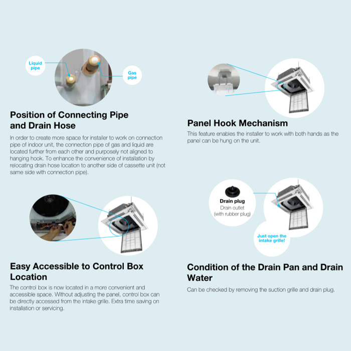 Kontrol Mudah dengan Kotak Akses Terintegrasi Unit ini dirancang agar kotak akses kontrol mudah dijangkau tanpa perlu membuka panel. Kontrol dapat langsung diakses melalui grille intake, menghemat waktu saat instalasi dan perawatan.