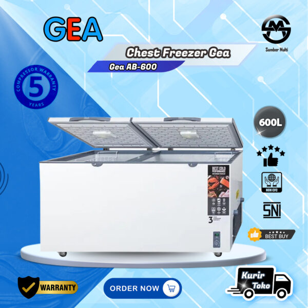 SPESIFIKASI CHEST FREEZER TIPE (AB-600 R) : Features: LED Interior Lamp Digital Thermometer Easy Open Door (Anti Vacuum) Basket, Keylock + Castor Compressor Fan Drain Hole