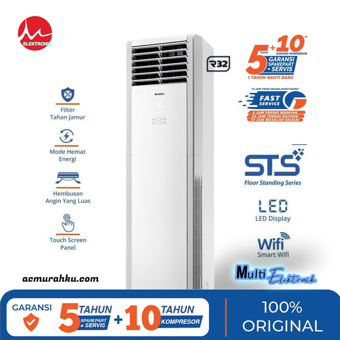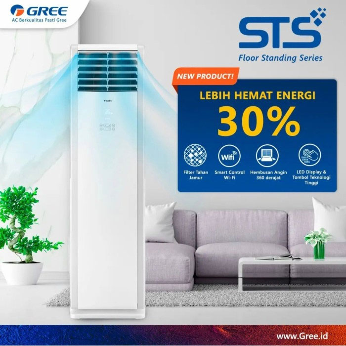 AC FLOOR STANDING GREE 2 PK STANDARD GVC-18STS STS SERIES (18.000 BTU/H) R32 3 PHASE Dirancang untuk memberikan pendinginan optimal di ruangan luas, AC ini menghadirkan desain elegan dengan tampilan modern. Sebagai AC Floor Standing pertama di Indonesia yang dapat dikontrol melalui Wi-Fi. Dilengkapi dengan fitur Mode hemat, Smart control Wi-Fi, Hembusan angin 360 derajat, Tombol Teknologi Tinggi, Led Display, Filter Tahan Jamur, 4 Perlindungan Keamanan, dan 6 Perlindungan Anti Karat.