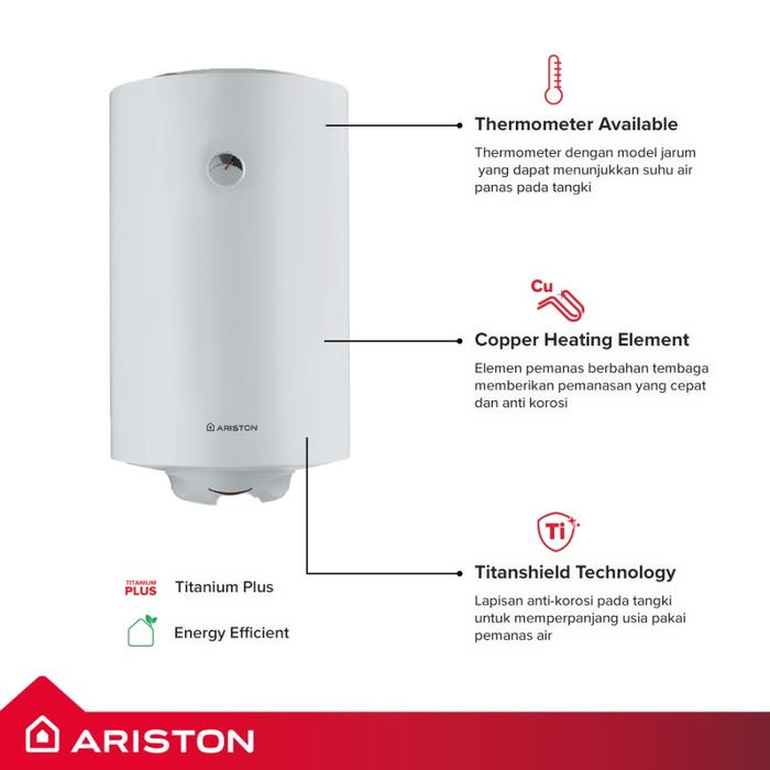 - Garansi 5 tahun untuk tangki dan 1 tahun untuk elemen pemanas (dengan maintenance min.1 kali setahun oleh teknisi resmi Ariston).