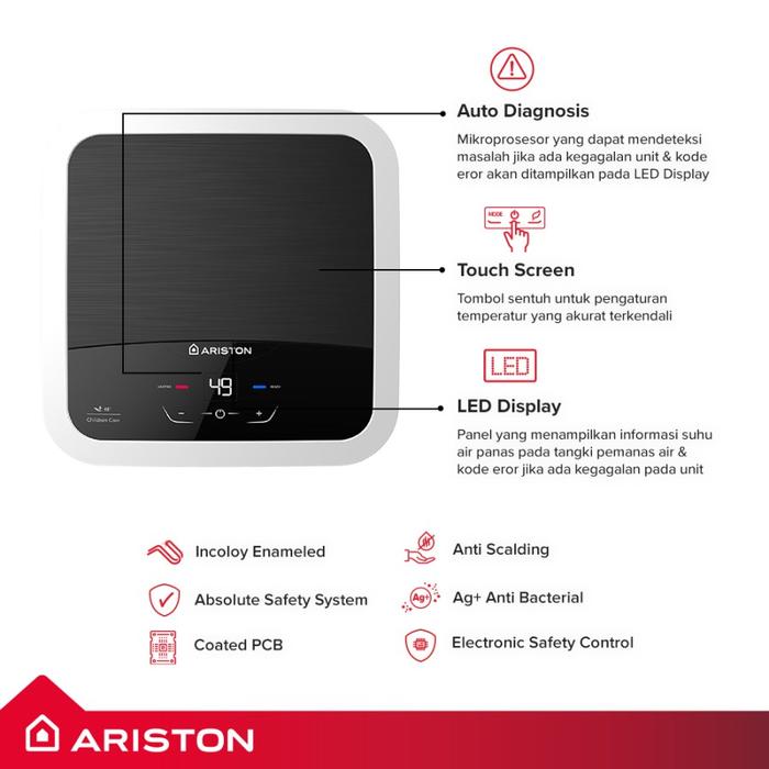 - Garansi 10 tahun untuk tangki dan elemen pemanas (dengan maintenance min.1 kali setahun oleh teknisi resmi Ariston).